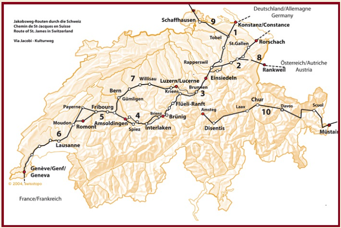 이 길은 긴 여정에서 중요한 경로 중 하나로, 독일에서 시작해 스위스를 가로질러 프랑스로 이어지는 다리 역할을 하고 있습니다. 특히 스위스는 알프스를 넘어야 하는 관문이기 때문에, 이 길을 걷는 순례자들에게 도전적인 구간으로 유명하였습니다. 이 길을 따라 형성된 마을들은 순례자들을 환대하는 전통을 가지고 있으며, 교회와 수도원은 순례자들이 쉬고 신앙적 위안을 받을 수 있는 장소로도 제공되고 있습니다.