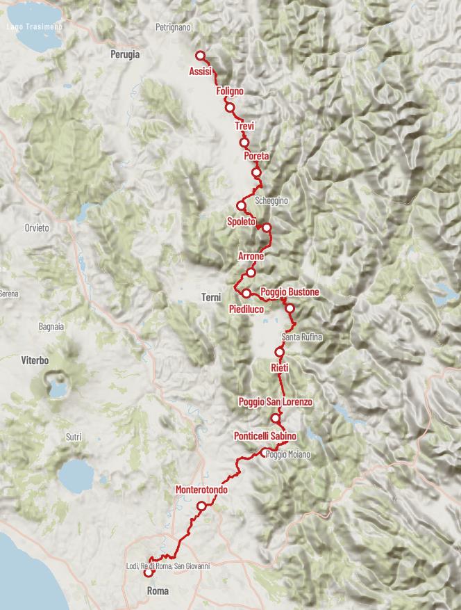 아시시 순례길은 약 240km의 경로로, 아시시에서 로마까지 이어집니다. 이 길은 여러 개의 구간으로 나뉘어 있으며, 각 구간마다 독특한 풍경과 문화적 명소가 있습니다. 대표적인 구간으로는 스폴레토, 파르티노, 그리고 카스텔누오보 등이 있습니다.